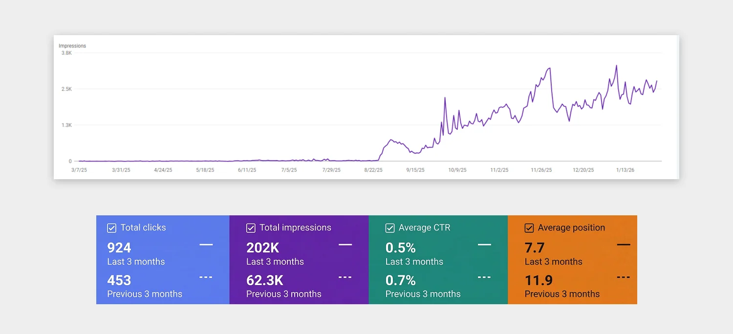 While the homepage remains a top performer, the newly created Insight pages now drive the vast majority of the site’s total impressions. One specific page regarding non-comedogenic oils achieved over 88,000 impressions, acting as a massive “top-of-funnel” magnet for new customers.